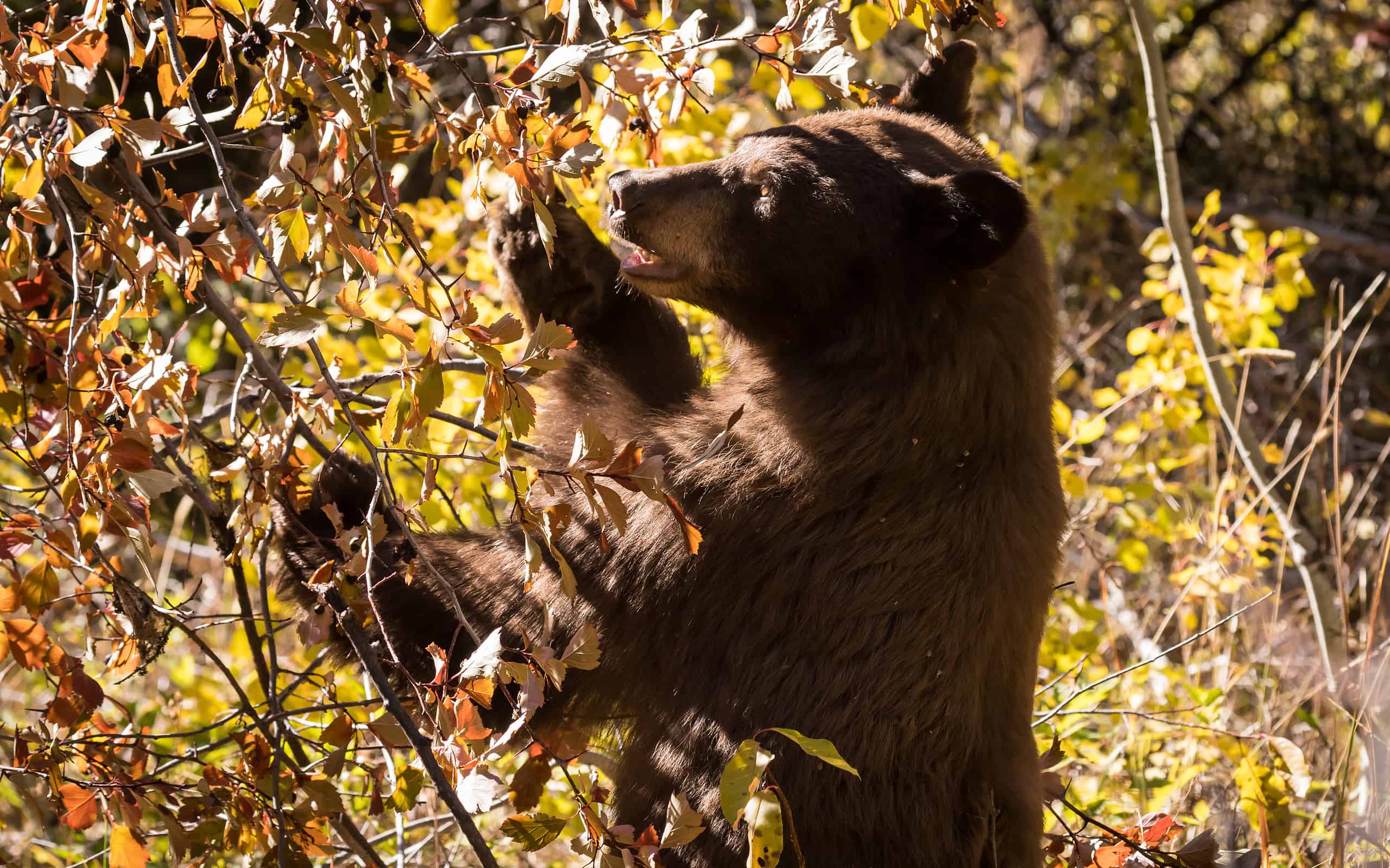 There are an estimated 16,000 black bears in Colorado. Most of the state’s bears live in the expansive oak and aspen forests. They primarily eat chokecherry and serviceberry. According to the Colorado Department of Parks and Wildlife, 90% of the state’s black bears are brown, honey-colored, or cinnamon-colored.
